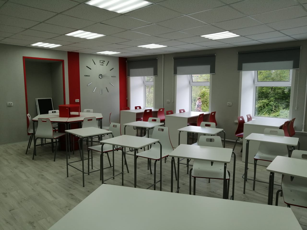 Оборудовано 2 кабинета под центры образования цифрового и гуманитарного профилей "Точка роста». В них обустроены функциональные зоны для обучения и для проектной деятельности, а также открытое пространство, выполняющее роль центра общественной жизни школы, включающее шахматную гостиную, зону коворкинга и медиазону. Все помещения снабжены современным оборудованием (ПК, МФУ, инструменты для уроков технологии, квадракоптеры, шлем VR, 3D-принтер, фотоаппарат, микрофоны, тренажеры-манекены для отработки сердечно-легочной реанимации, наборы имитаторов травм и поражений и другая техника). Кабинеты оформлены в едином фирменном стиле.