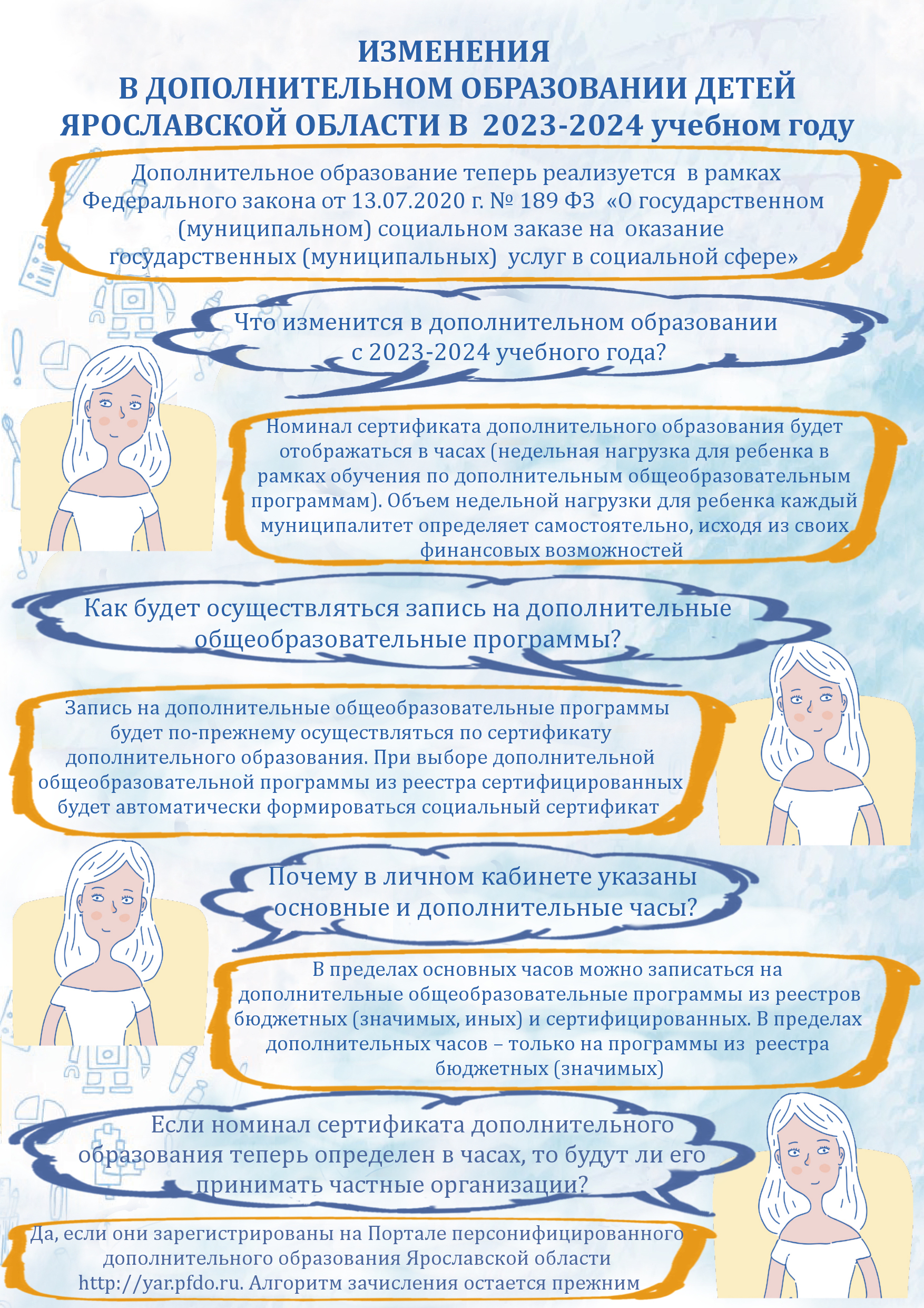 Данная информация поможет вам разобраться во всех вопросах, связанных с переходом с 01.09.2023 на Федеральный закон от 13.07.2020 № 189-ФЗ «О государственном (муниципальном) социальном заказе на оказание государственных (муниципальных) услуг в социальной сфере», функционированием системы персонифицированного дополнительного образования, получением и использованием сертификата дополнительного образования, выбором дополнительных общеобразовательных программ.